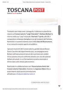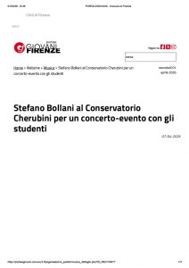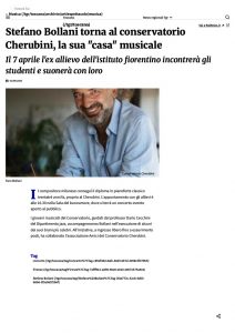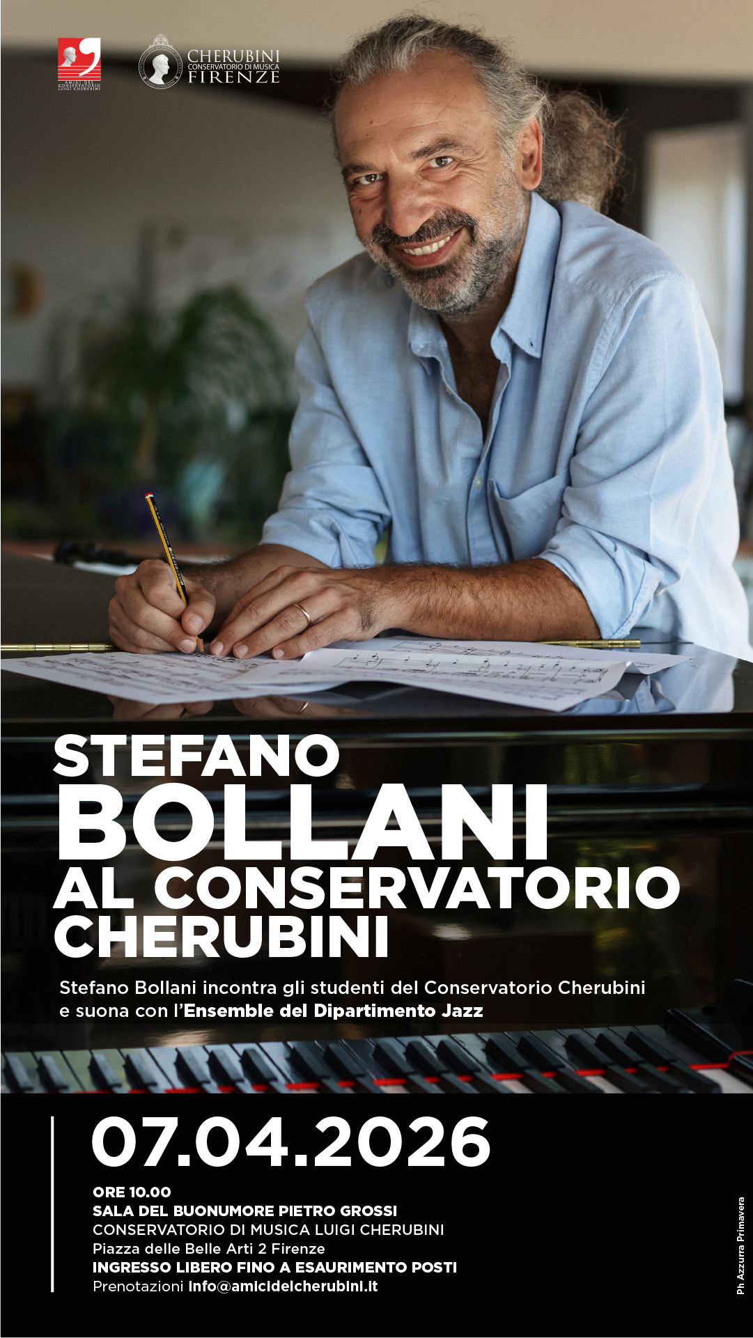 Lo scorso 7 aprile il musicista Stefano Bollani e‘ tornato al Conservatorio Cherubini dopo 33 anni dal diploma, per un evento ideato della nostra Associazione e realizzato in piena sintonia con la Presidente del Conservatorio, del Direttore e dei docenti. Bollani ha condiviso il palco suonando e dialogando con gli studenti del Dipartimento Jazz, guidati dal professore Dario Cecchini.
